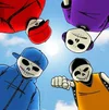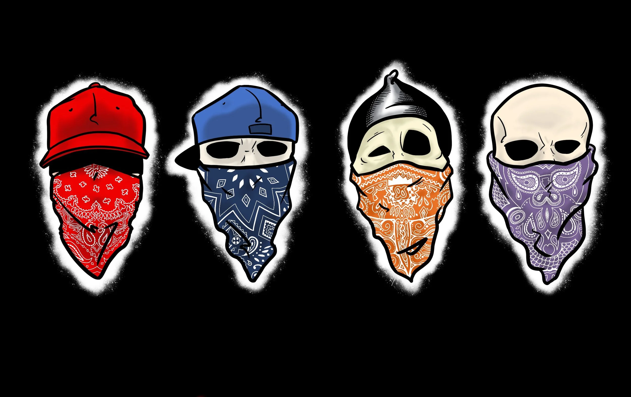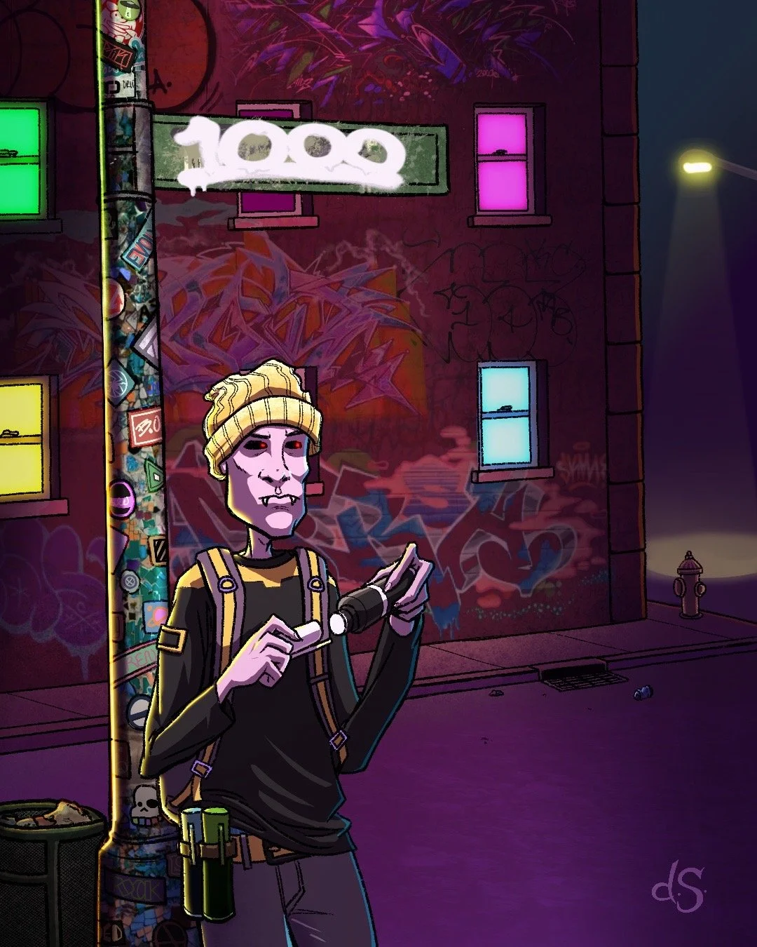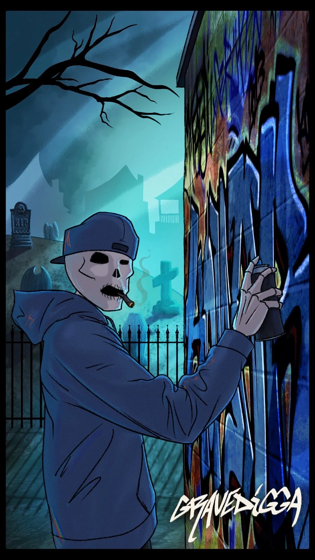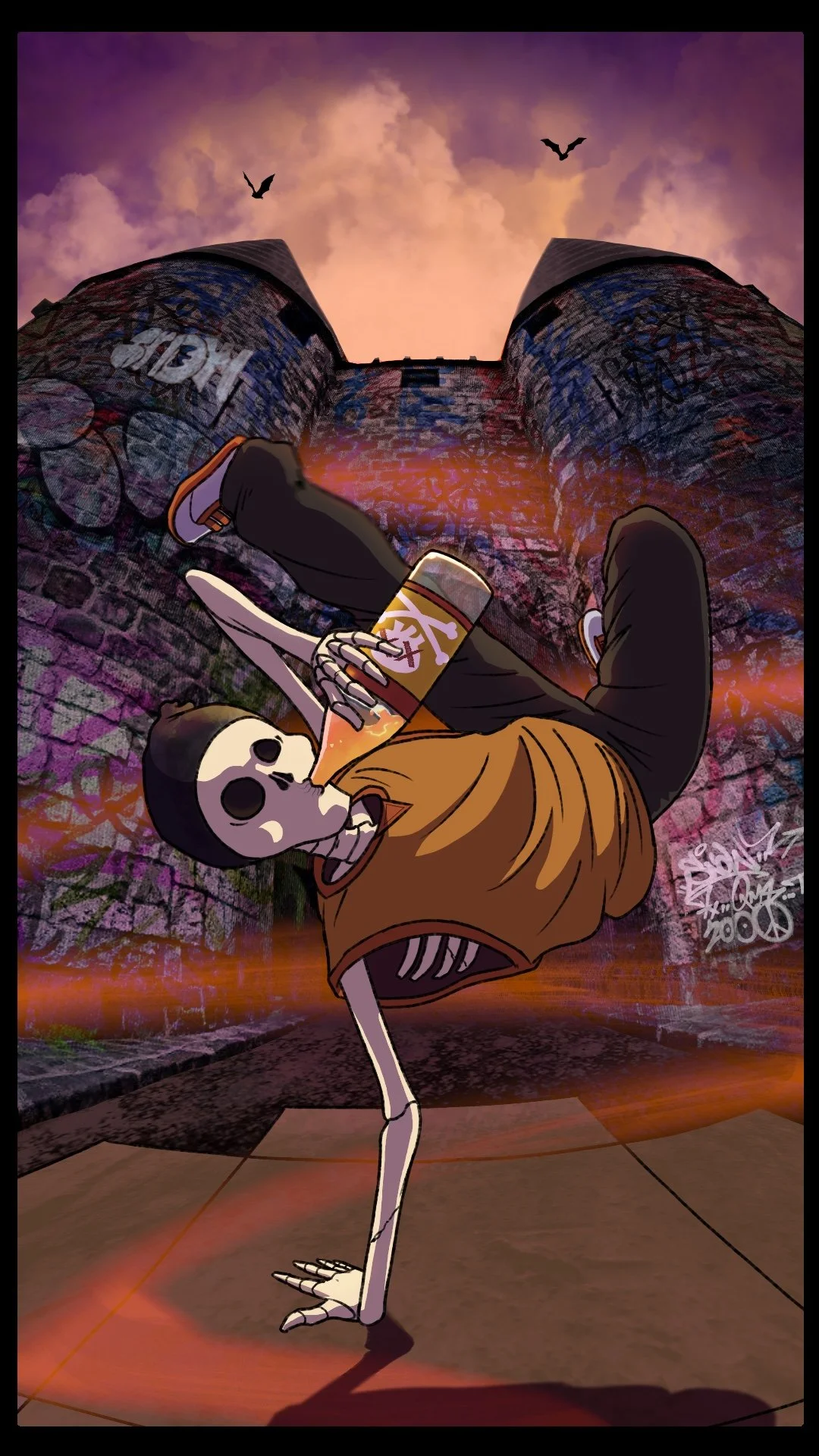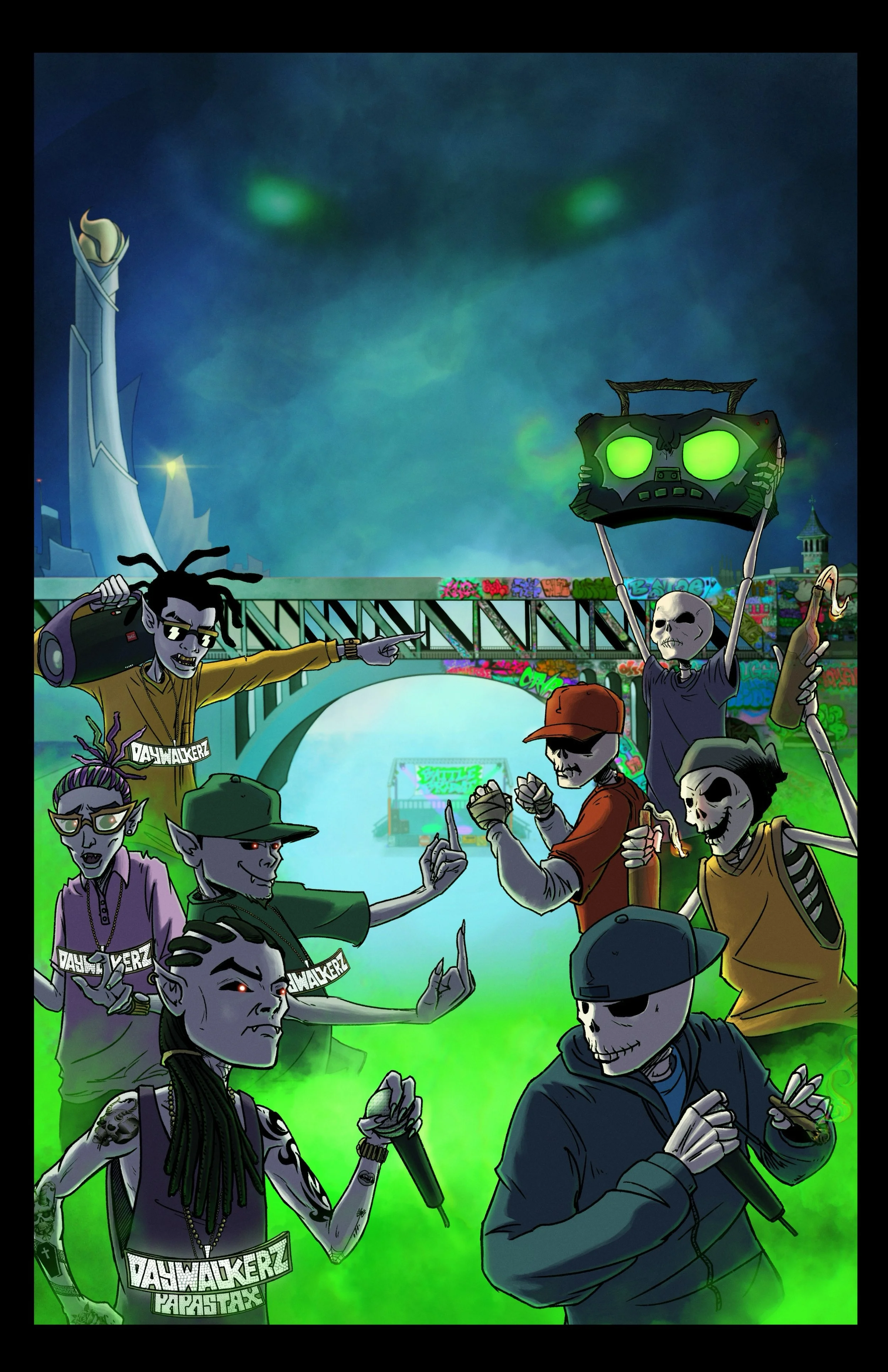 Illustration of cartoon skeletons and creatures with boomboxes in front of a graffiti-covered bridge, wearing streetwear and holding microphones, set against a night sky with glowing green eyes in the background. View fullsize